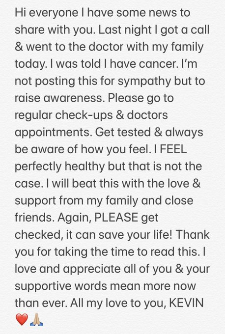 Kevin is battling cancer. You can see his reveal below. He shared that he went to the doctor with his family and found out this heartbreaking news. It does sound like he found out at a check-up, but so far he hasn't given all the details.